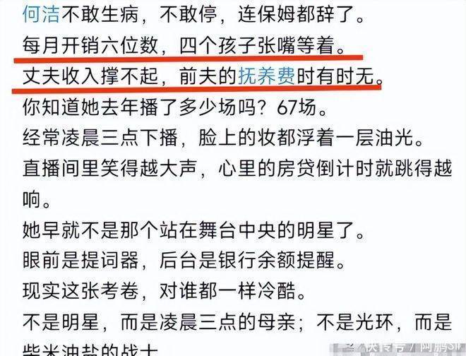 直播间里有人骂她是过气超女出来捞金,她没有反驳,只是默默啃着面包,继续介绍产品。寒风中穿着单薄的裙子去赶户外商演,嗓子哑到连话都说不清,她依旧坚持真唱,从不敷衍。自己的演唱会最便宜的票也只卖99块钱,当年的超女风光早已淡去。她甚至辞掉了家里的保姆和司机,从清晨送孩子上学到深夜整理家务,大小事务全都亲力亲为。素颜出镜的日常里,厚重的黑眼圈让滤镜也掩盖不了,她累到几乎脱相,可这样的诉苦仍然引来大量网友质疑。原因其实很简单,何洁眼中的难,与普通人的难完全不在同一个层级。有网友扒出,她在2025年的67场直播外,还有五十多场商演,总收入至少两千万,商演报价从离婚后的每场两万元慢慢回升到百万级别,她创立的母婴品牌估值也达到八千万。